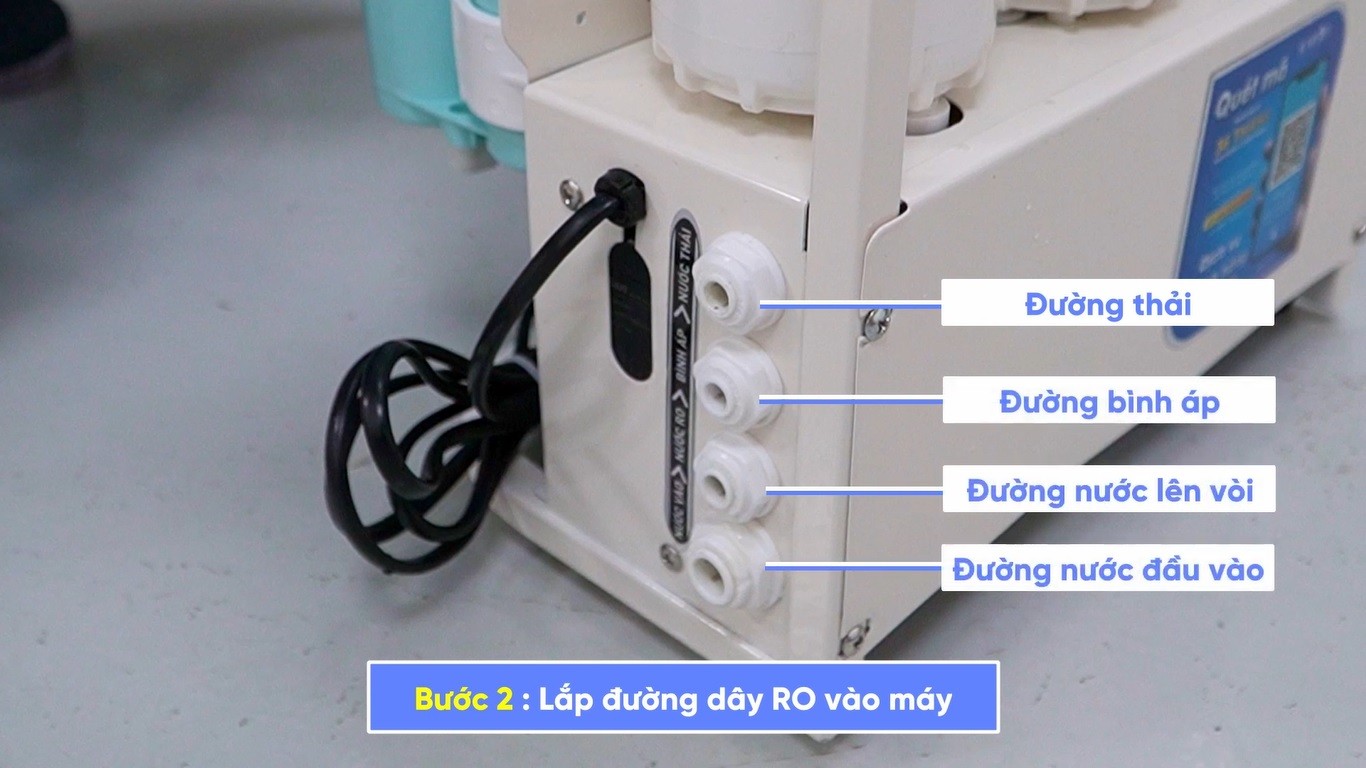 Kết nối van với bình áp, sử dụng một dây dẫn nước, một đầu kết nối với van bình áp, đầu còn lại lắp đặt vào màng lọc RO.